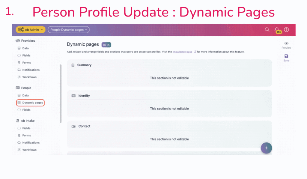 The ability to tailor the Person profile to meet your organization’s specific needs is crucial for efficient and effective data management. That’s why we have now made it possible for Administrators to access Dynamic pages under Admin → People → Dynamic pages. This exciting update allows you to customize various sections of the Person profile, including Identity, Contact, Health and Medical, Education, and Employment and Finances.